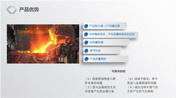 我司是研發(fā)、生產(chǎn)鑄造專用高溫陶瓷澆道管、橫澆道、直澆道、內(nèi)澆道、澆口杯、過濾座等系列產(chǎn)品的高科技企業(yè),耐火陶瓷管產(chǎn)品性能在行業(yè)中處于領(lǐng)先地位,填補了國內(nèi)空白,是提高鑄件內(nèi)在質(zhì)量的必備輔助材料。在中國是核電、高鐵及跨國大型鑄造集團(tuán)指定耐火澆道供應(yīng)商。經(jīng)過應(yīng)流股份(603308)、中車集團(tuán)株洲電力機(jī)車有限公司、中車集團(tuán)長江車輛有限公司銅陵分公司,株洲斯威鐵路產(chǎn)品有限公司、泰鋼合金(深圳)、Metso Outotec、andritz、江蘇神通閥門股份有限公司等數(shù)十家集團(tuán)企業(yè)的使用,一致認(rèn)為該系列產(chǎn)品能有效提高鑄件質(zhì)量。特別是對檢測手段嚴(yán)格的高端鑄件質(zhì)量提高明顯。廣泛用于高端鑄造企業(yè)生產(chǎn)核電、礦機(jī)、高鐵、風(fēng)電等高端鑄件。